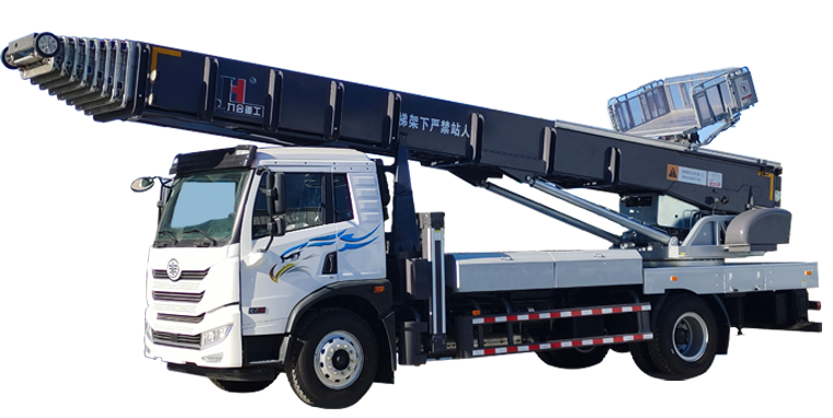 36米云梯車可傳送 400kg 重的貨物,用于高度小于36 米的高空裝卸作業(yè)。該云梯車主要由車架總成、云梯總成、小車總成、轉(zhuǎn)臺總成、卷揚(yáng)機(jī)總成、液壓系統(tǒng)總成、電氣系統(tǒng)總成等組成。傳送貨物時,4 個液壓支撐伸出,加強(qiáng)了整機(jī)的穩(wěn)定性。 該云梯車,采用一汽解放底盤,整車重量控制在4.5噸以內(nèi),掛藍(lán)牌,C1駕照就可駕駛,免購置稅,不需要操作證,非營運(yùn)車輛,使用期限30 年。